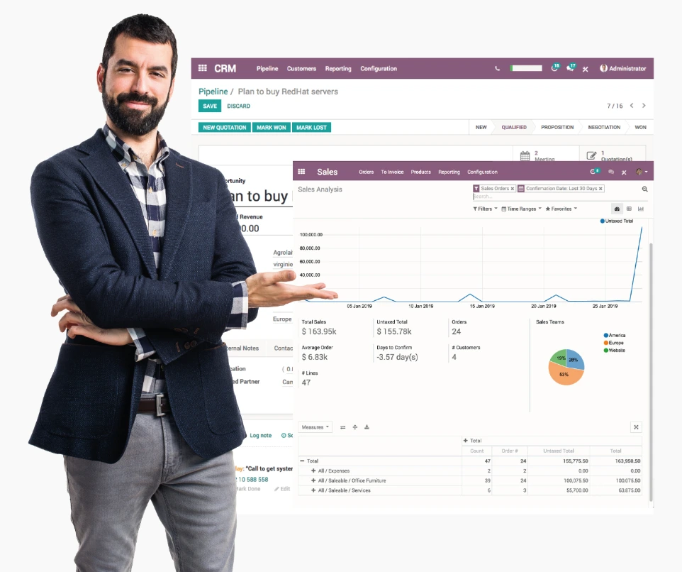 Centraliza tu gestión en una plataforma única. Odoo integra ERP, CRM y E-commerce para que te olvides de los datos duplicados y optimices cada proceso. Controla tu empresa en tiempo real y desde cualquier dispositivo. Más de 50,000 empresas ya optimizan su día a día con nosotros.